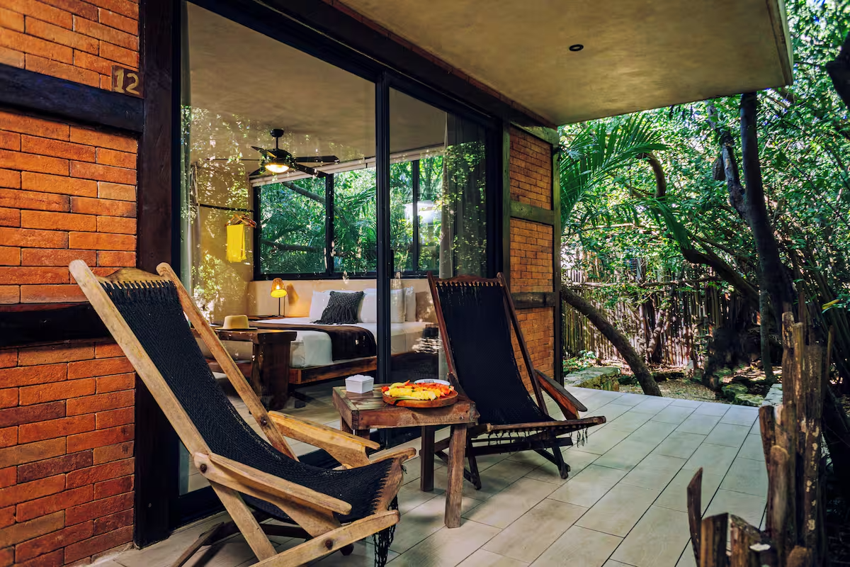 This small jungle hotel is on the “beach road” in Tulum and would allow us to walk or scooter everywhere we want to go. We would have separate rooms, each room has Wifi and AC. I would expect a lot of energy in the area, not a tranquil stay.